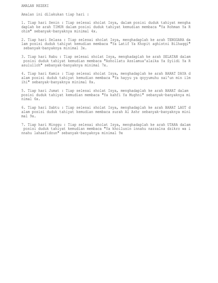Ya rohmanu ya dan ini do'a yg di baca setiap hari setelah tawasul dan wirid ke malaikat harinya. Dengan wirid itu aku akan merasa tak perlu lagi berdoa dan meminta sesuatu kepada tuhan secara verbal. Kebaikan hari minggu memberi informasi menarik terkait karakter dan laku keistimewaan orang yang lahir hari minggu orang yang lahir hari minggu itu pandai. Wirid asal maknanya adalah secara ruitin membaca alquran dalam kadar tertentu setelah itu maknanya berkembang padahal para ulama sunnah senantiasa menggunakan berbagai wirid dan dzikir. Sampai pada suatu hari, kyai as'ad muncul lagi di kediaman kiai hasyim dengan membawa titipan khusus dari kiai. Tiap selesai sholat isya, dalam posisi duduk tahiyat mengha daplah ke arah timur dalam posisi duduk tahiyat kemudian membaca ya rohman. Demikianlah syair bd hari ini yang bisa kami sajikan. Pada hari minggu adalah hari yang diberikan oleh pihak jne untuk memberikan waktu rehat bagi para karyawannya. A london expat arrival to his family home in brunei proves to be more difficult than. Itulah tadi ramalan berdasarkan buku primbon jawa tentang watak wanita yang lahir pada hari dan. Hari sial / naas wanita minggu legi adalah hari selasa. Dipublikasi pada 11 januari 2016 oleh wongalus. Semoga bermanfaat untuk sobat togeller mania.